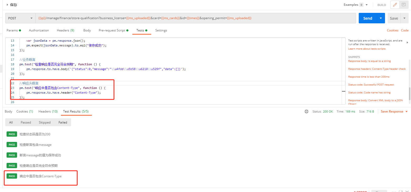 在Tests页面,点击右边的Response headers: Content-Type header check,即可看到对应的断言代码出现