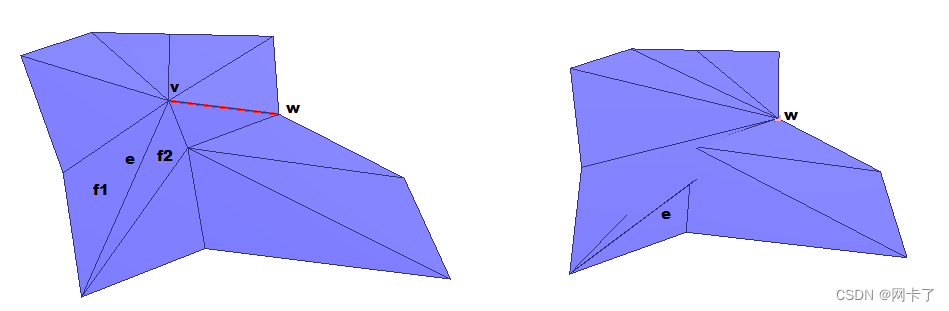 边v-w塌陷到顶点w之前和之后的简单网格。虽然f1和f2的法线几乎相等,但在边塌陷之后它们是相对的。