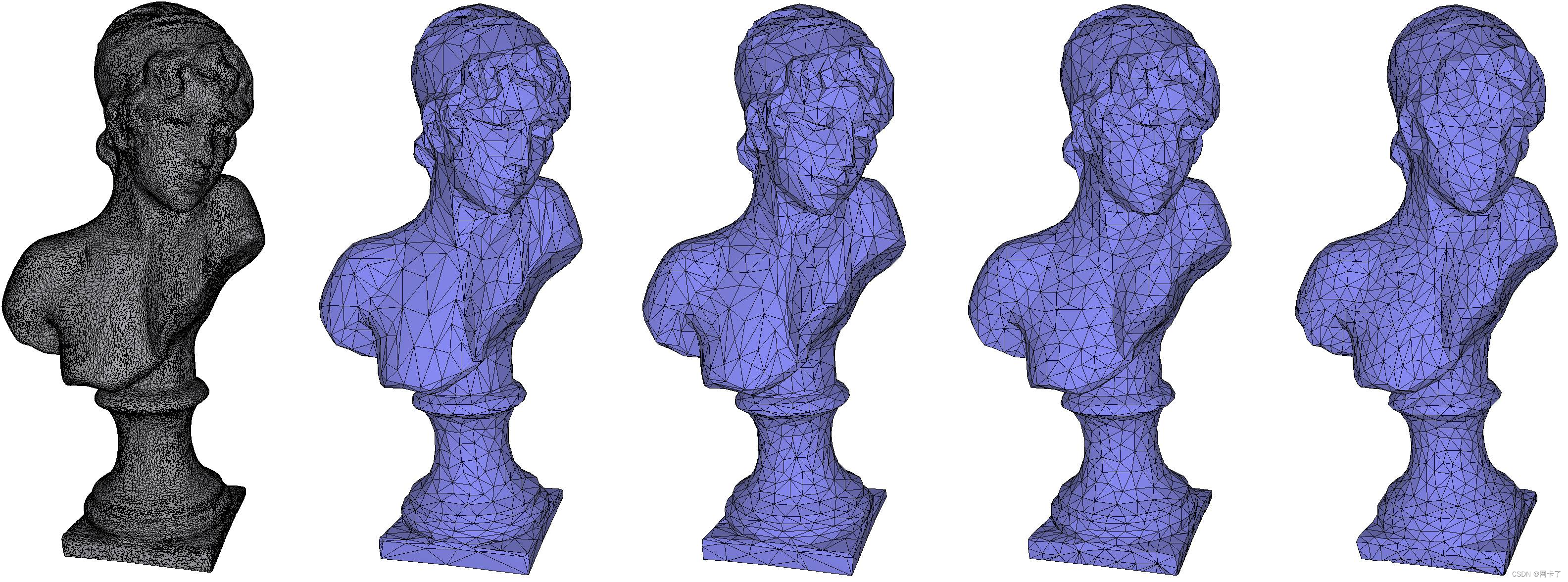 Sappho's Head模型(最左边,34882个顶点)。从左到右,四个Garland Heckbert变体的简化输出(1745个顶点)和对称Hausdorff距离:平面(0.217912)、概率平面(0.256801)、三角形(0.268872)和概率三角形(0.490846)。