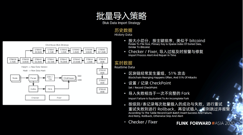如果超过51%的算力,就会达到这样的效果,成为最长的链,这个是累计难度比较高的,此时我们会认为数据导入失败,同时我们会利用回撤的功能,不断将其回滚和重组,直到满足最完整的链。当然我们也会设置一些记录和 CheckPoint ,这里的 CheckPoint 和 Flink 的 CheckPoint 的概念也有所区别。