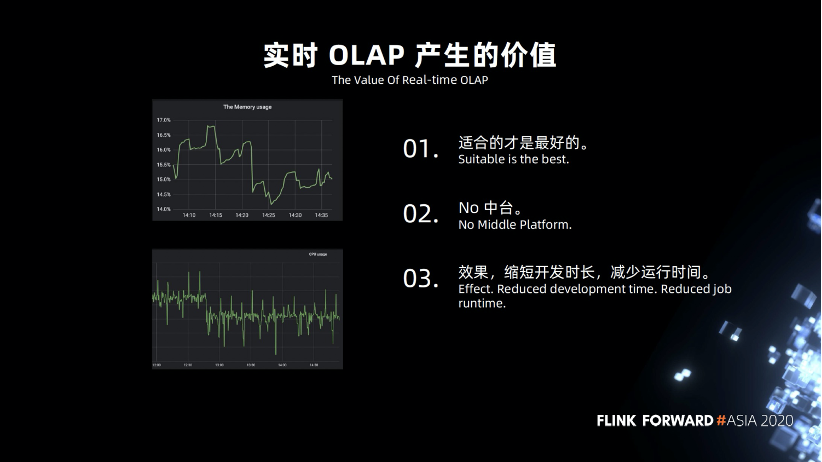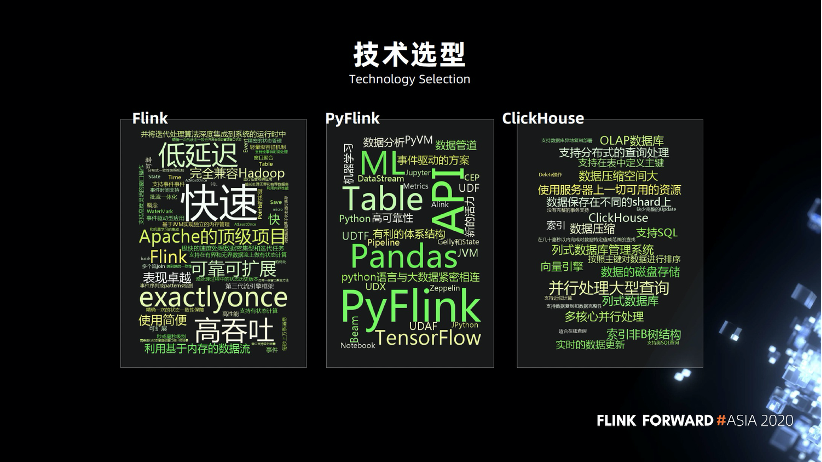 我们实际调研以后,发现 Flink 还是有很多优势,比方说灵活的窗口,精准的语义,低延迟,支持秒级的,实时的数据处理。因为团队本身更熟练 Python ,所以我们当时就选择了 PyFlink ,有专业的开发团队支撑,近几个版本变化比较大,实现了很多功能。在实时 OLAP 方面,数据库我们采用了 ClickHouse 。