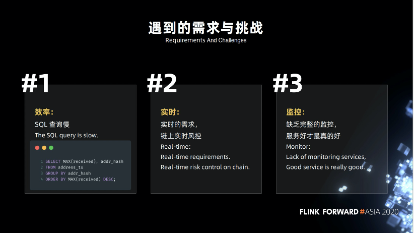 监控,实时需求,如实时风控,每当区块链出现一个区块,我们就要对它进行分析,但是区块出现的时间是随机的。缺乏完整的监控,有时候作业突然坏了,或者是没达到指标,我们不能及时知道。