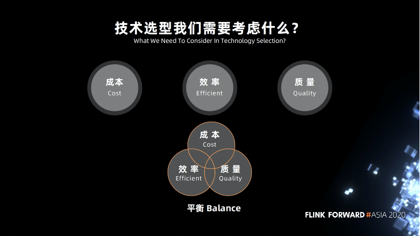 在技术选型的时候我们需要考虑什么呢?首先是缩容,2020年行情不太好,大家都在尽力缩减成本,更好的活下去。在成本有限的情况下,我们如何能做更多的东西,必须提高自身的效率,同时也要保证质量。所以我们需要找到一种平衡,在成本效率还有质量这三者之间进行一定的平衡。