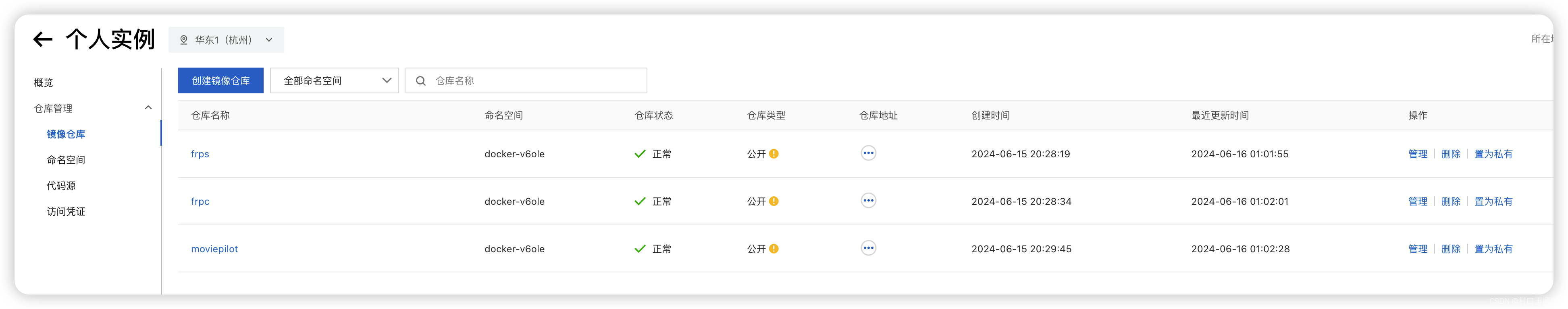 回到阿里云,镜像仓库,点击任意镜像,可查看镜像状态。(可以改成公开,拉取镜像免登录)