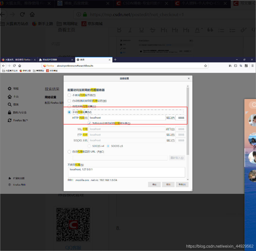 3.在火狐浏览器中修改代理器的ip地址,如图所示