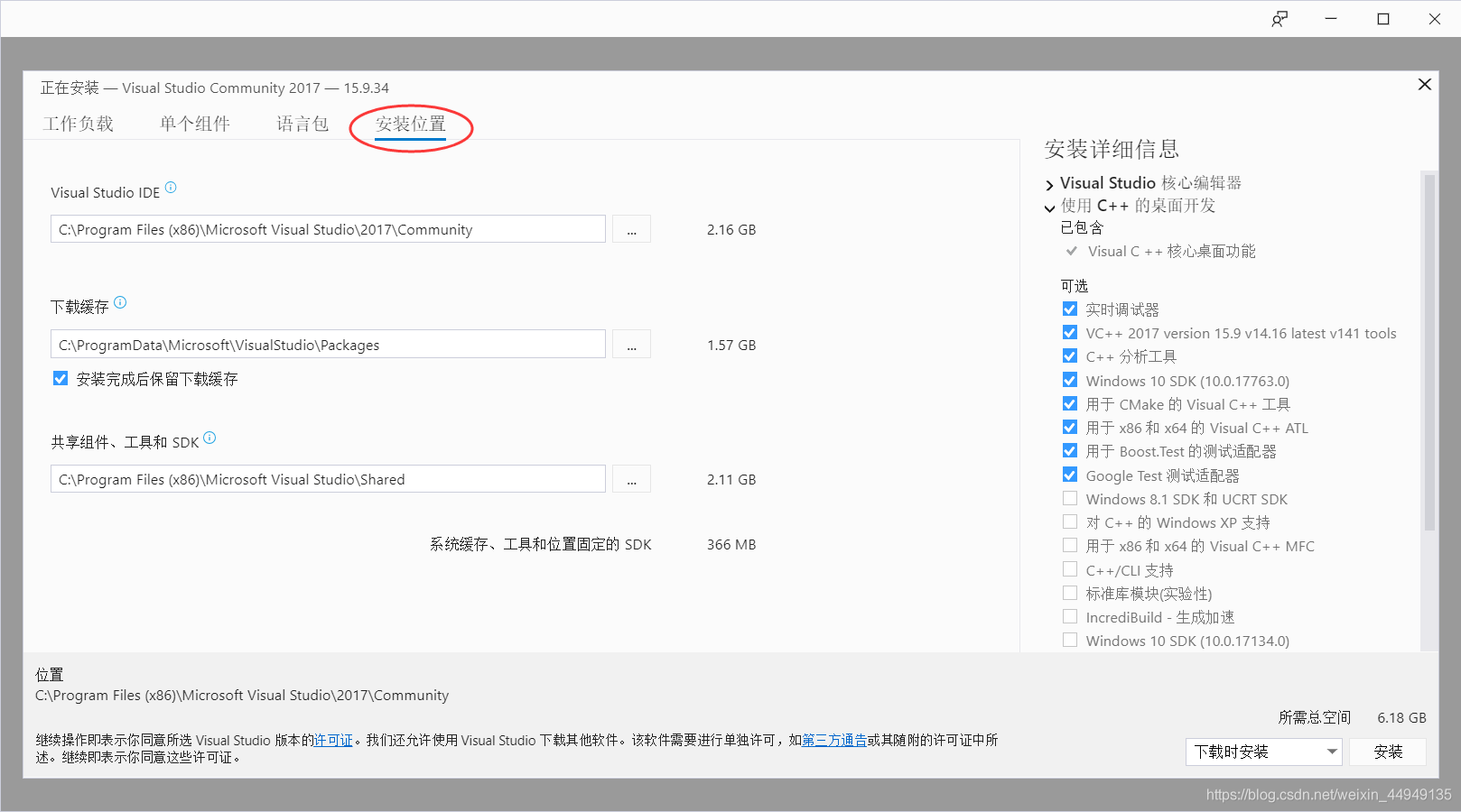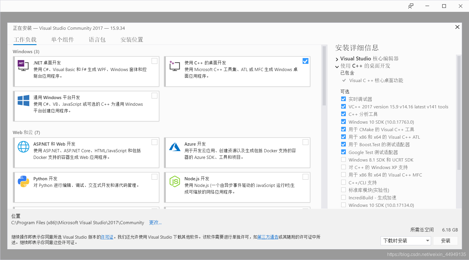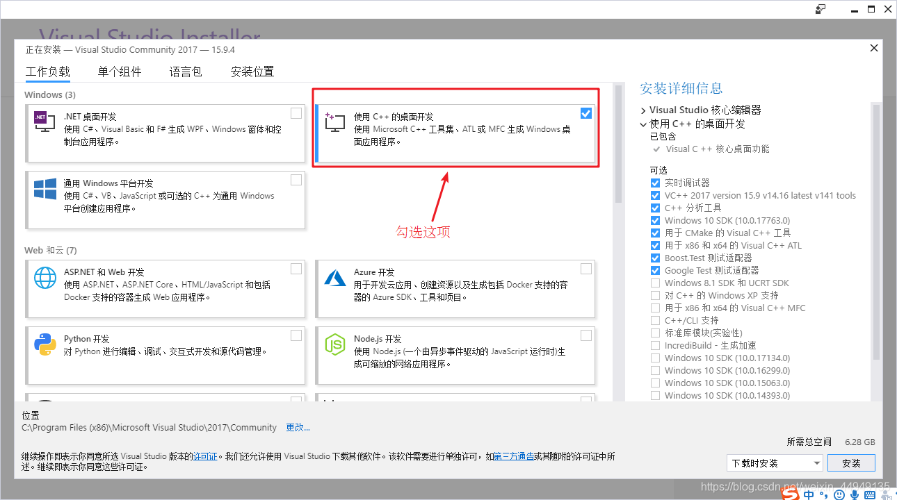 选择 使用C++的桌面开发 这一选项,如需其他,自行勾选。