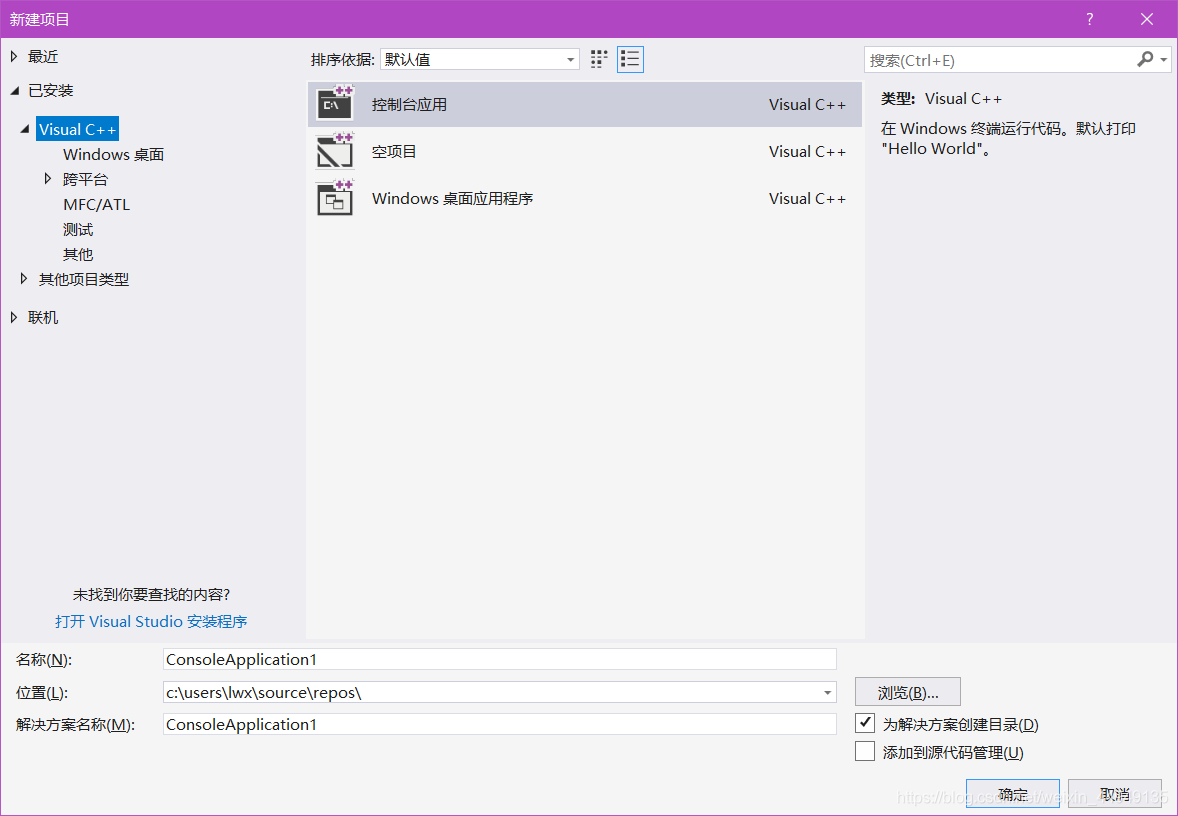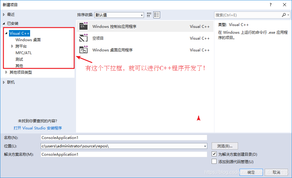 点击 创建新项目 按钮 ,如果出现以下模板选项,证明安装成功,并可以创建C++项目!