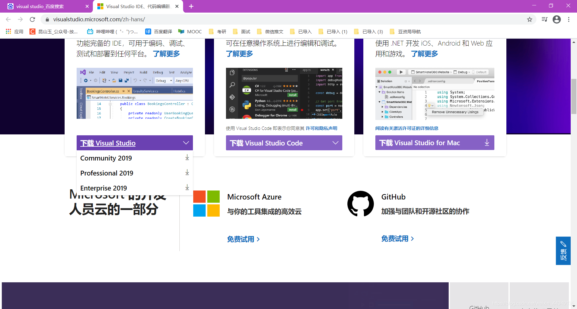 进入Visual Studio 官网(https://visualstudio.microsoft.com/zh-hans/)后,选择下载Windows版,并选择Community 2017 社区版本(免费版)进行下载。