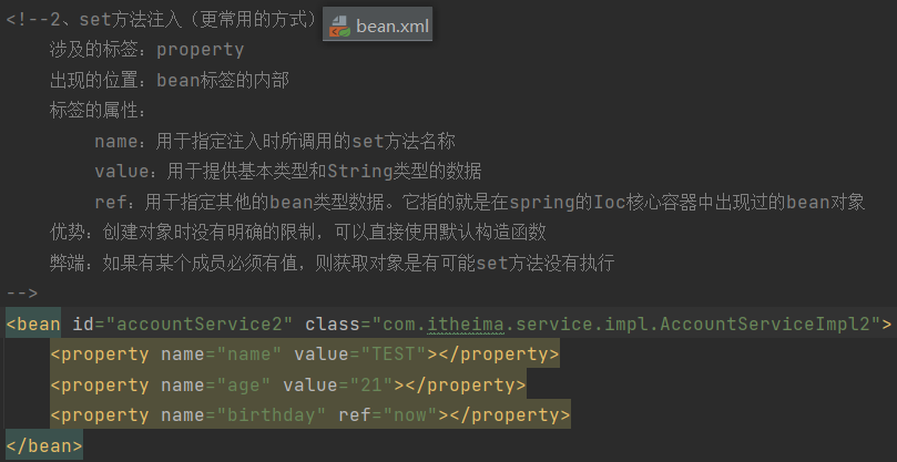 ref:用于指定其他的bean类型数据,它指的就是在spring的Ioc核心容器中出现过的bean对象