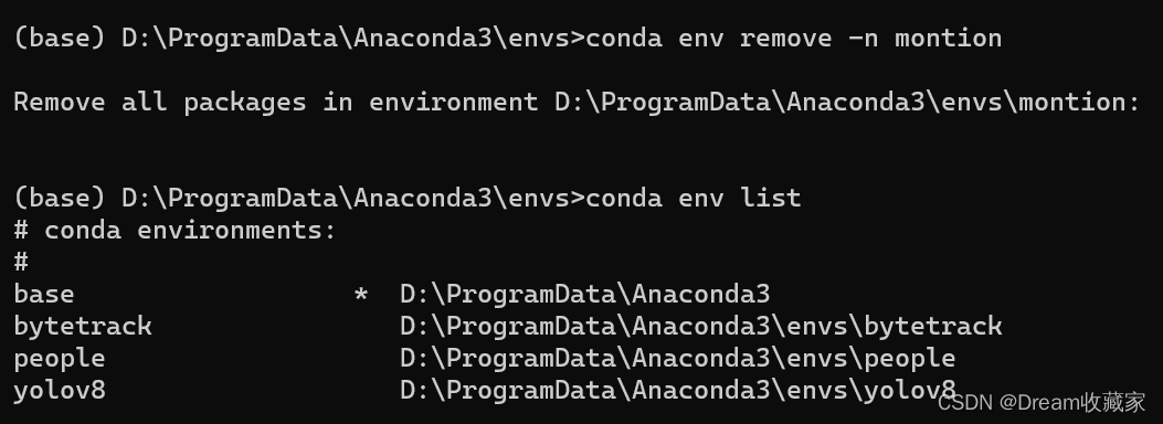 用conda remove -n montion --all和conda env remove -n montion都没用,怎么才能完全删除虚拟环境啊。删conda虚拟环境的时候,Pycharm忘记关了,命令框中虚拟环境已经删除了。