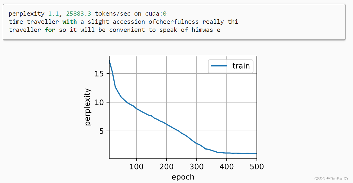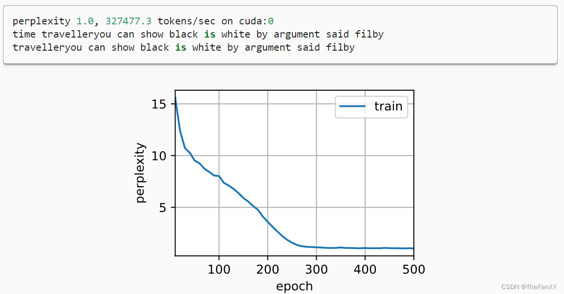 训练结束后,我们分别打印输出训练集的困惑度, 以及前缀“time traveler”和“traveler”的预测序列上的困惑度。