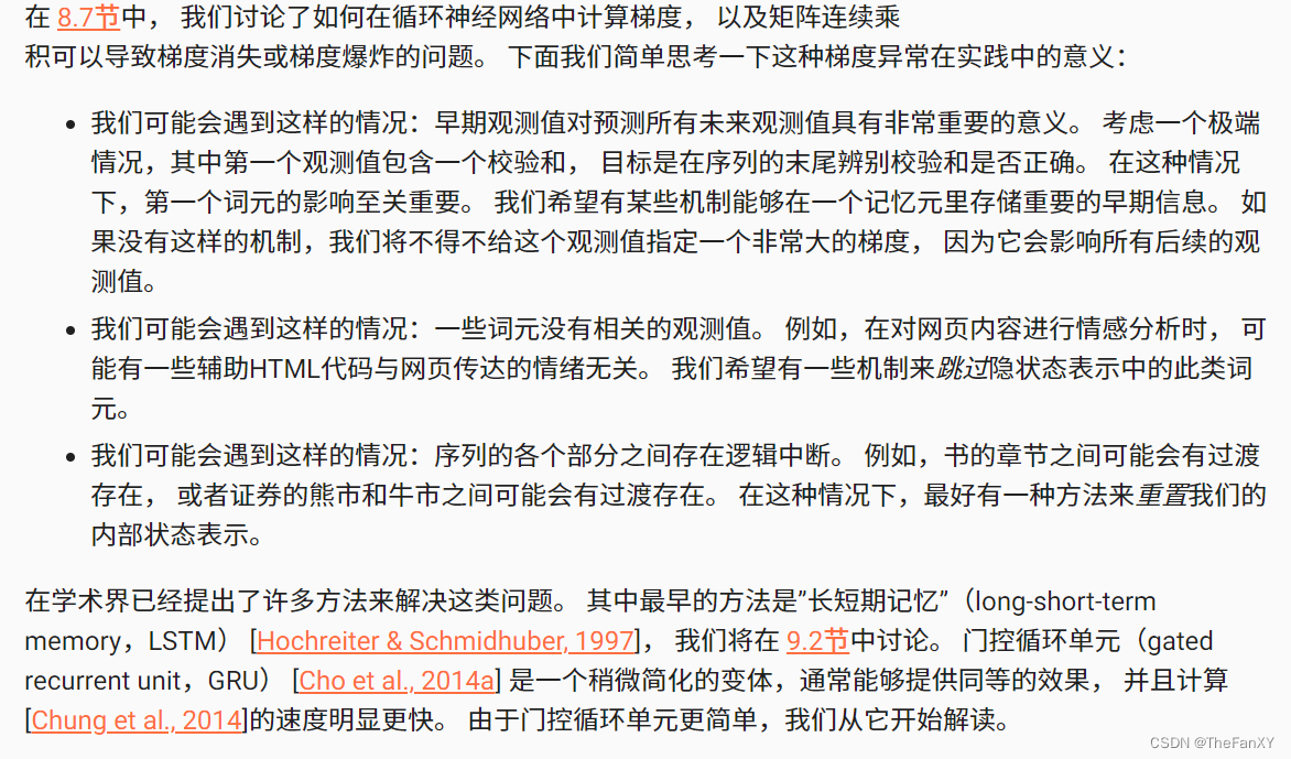 门控循环单元与普通的循环神经网络之间的关键区别在于: 前者支持隐状态的门控。 这意味着模型有专门的机制来确定应该何时更新隐状态, 以及应该何时重置隐状态。 这些机制是可学习的,并且能够解决了上面列出的问题。 例如,如果第一个词元非常重要, 模型将学会在第一次观测之后不更新隐状态。 同样,模型也可以学会跳过不相关的临时观测。 最后,模型还将学会在需要的时候重置隐状态。 下面我们将详细讨论各类门控。
