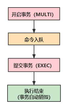 Redis中的事务是没有隔离性的,因此也更不具备隔离级别这一说法,并且Redis的事务并不是直接执行的,而是需要经过命令提交时候才能执行,Redis事务的执行流程图如下: