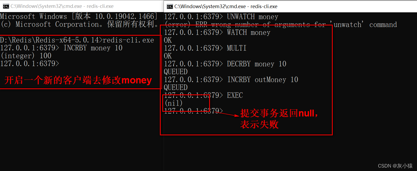 但是如果我们现在重复刚才的操作(正常情况下money应该变成80),但是并不急着提交事务,而且开启一个新的Redis客户端,在其中对我们的money加10,之后再提交上一个上一个事务,就会提示我们的money已经被修改,这个时候事务一定是执行失败的!