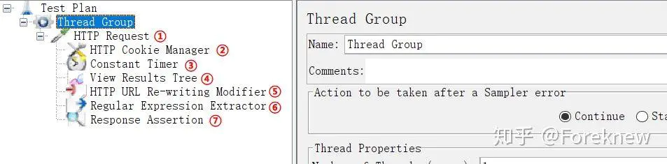 其中①为取样器、②为配置元件、③为定时器、④为监听器、⑤为前置处理器、⑥为后置处理器、⑦为断言。