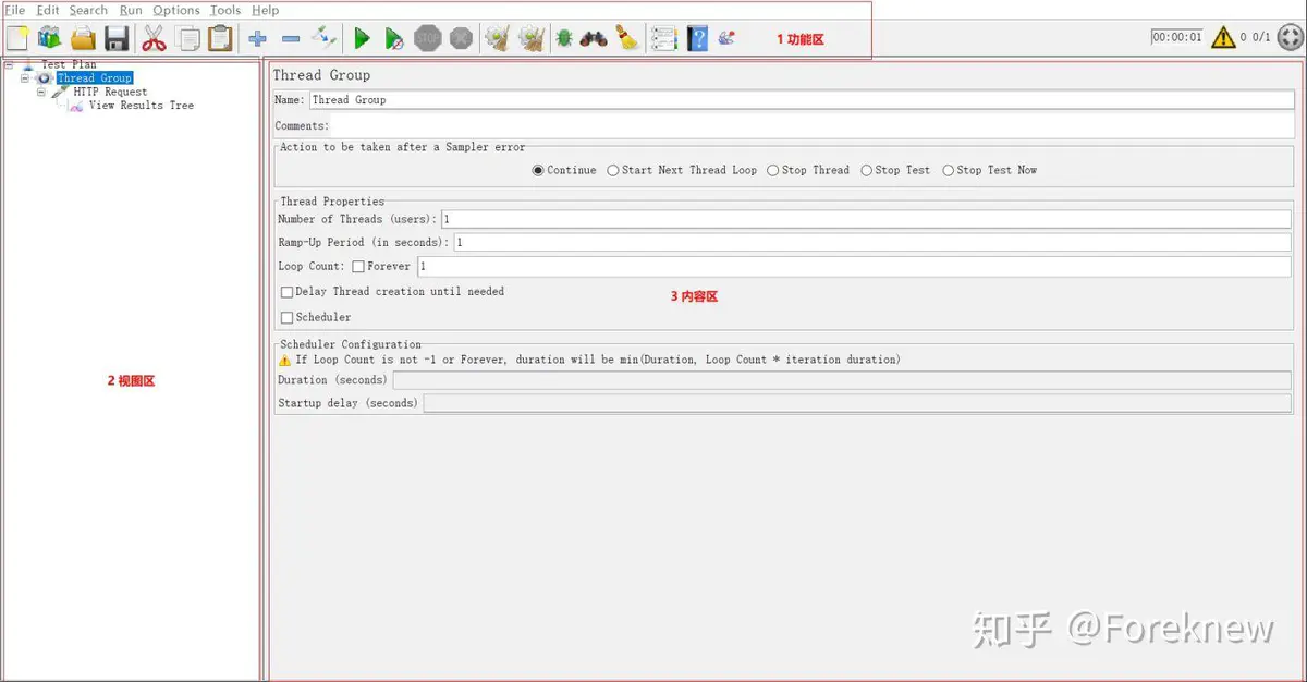 当JMeter以GUI模式运行时,窗口主要由三部分构成: