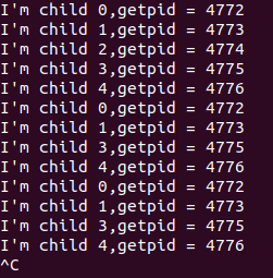 printf("I'm child %d,getpid = %u\n",i,getpid());