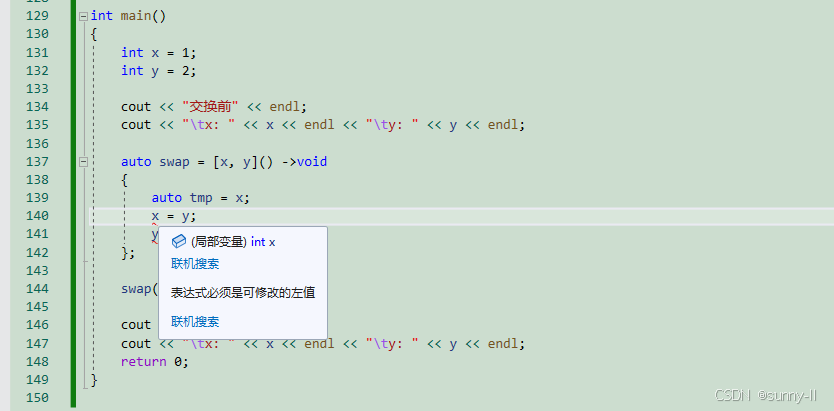 x、y” 中,捕捉列表 中的参数默认具有 常量属性,不能直接修改,但可以添加mutable关键字 取消常性