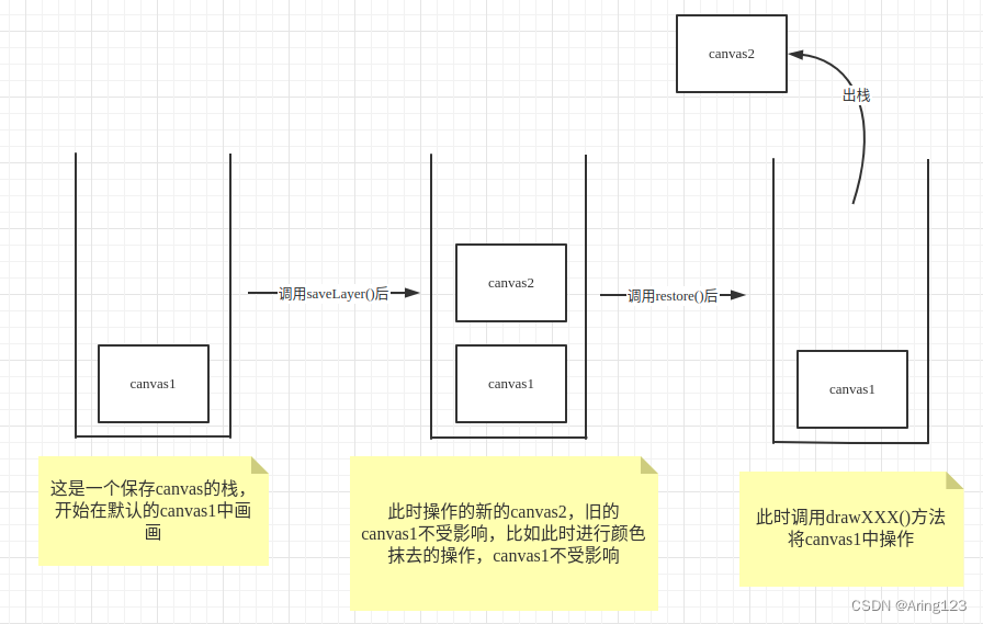 到这里就能理解了,用saveLayer()保存了蓝色那一小块的地方,同时新创建的一张canvas大小也是只有蓝色矩形那一小块,所有只能操作这一小块了,还有restore()方法可以恢复上一个canvas,canvas是由一个栈去管理,drawXXX()操作的是栈顶的canvas,画一张图方便理解