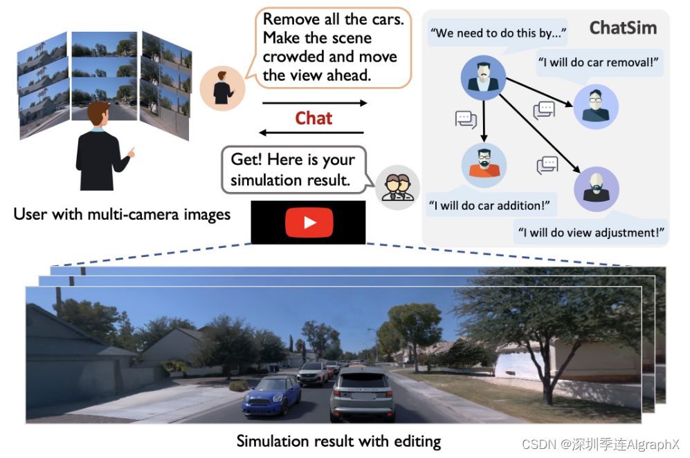 ChatSim利用了大型语言模型LLM智能体协作框架,采用了一种新颖的多摄像头神经辐射场McNeRF和多摄像头照明估计McLight方法实现了自动驾驶场景可编辑与生成。