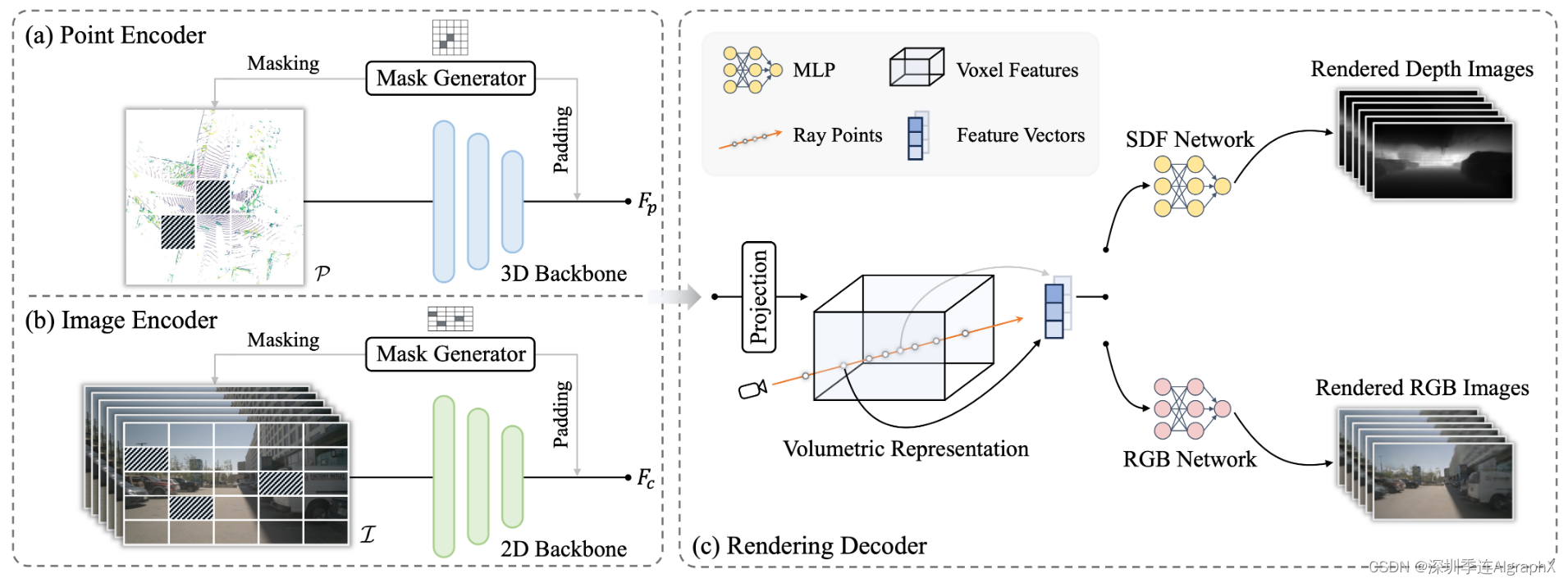 UniPAD提出了一种自动驾驶通用的自监督预训练范式,巧妙地将NeRF作为统一的3D渲染解码器,使其能够无缝集成到2D和3D框架中。