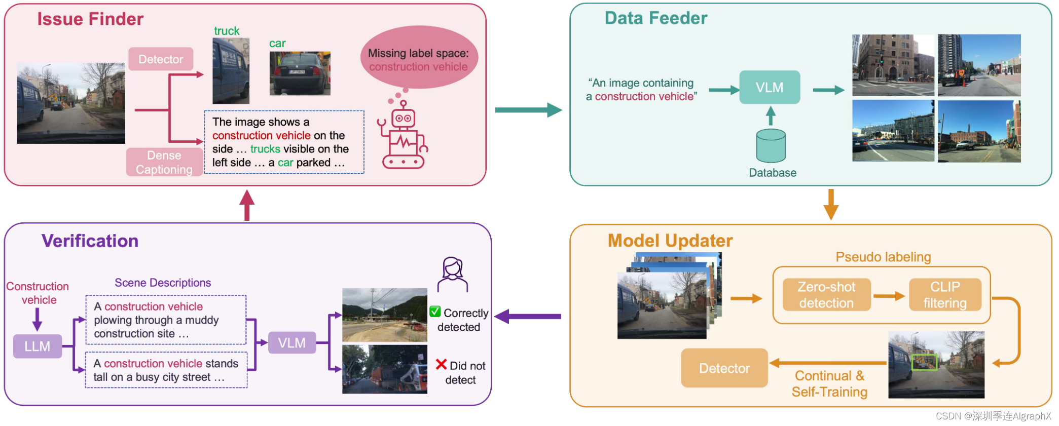 本文利用视觉语言模型VLM、大型语言模型LLM设计了一个自动化数据引擎AIDE。该引擎可以自动识别问题、有效地整理数据、通过自动标注改进模型,并通过生成不同的场景来验证模型。