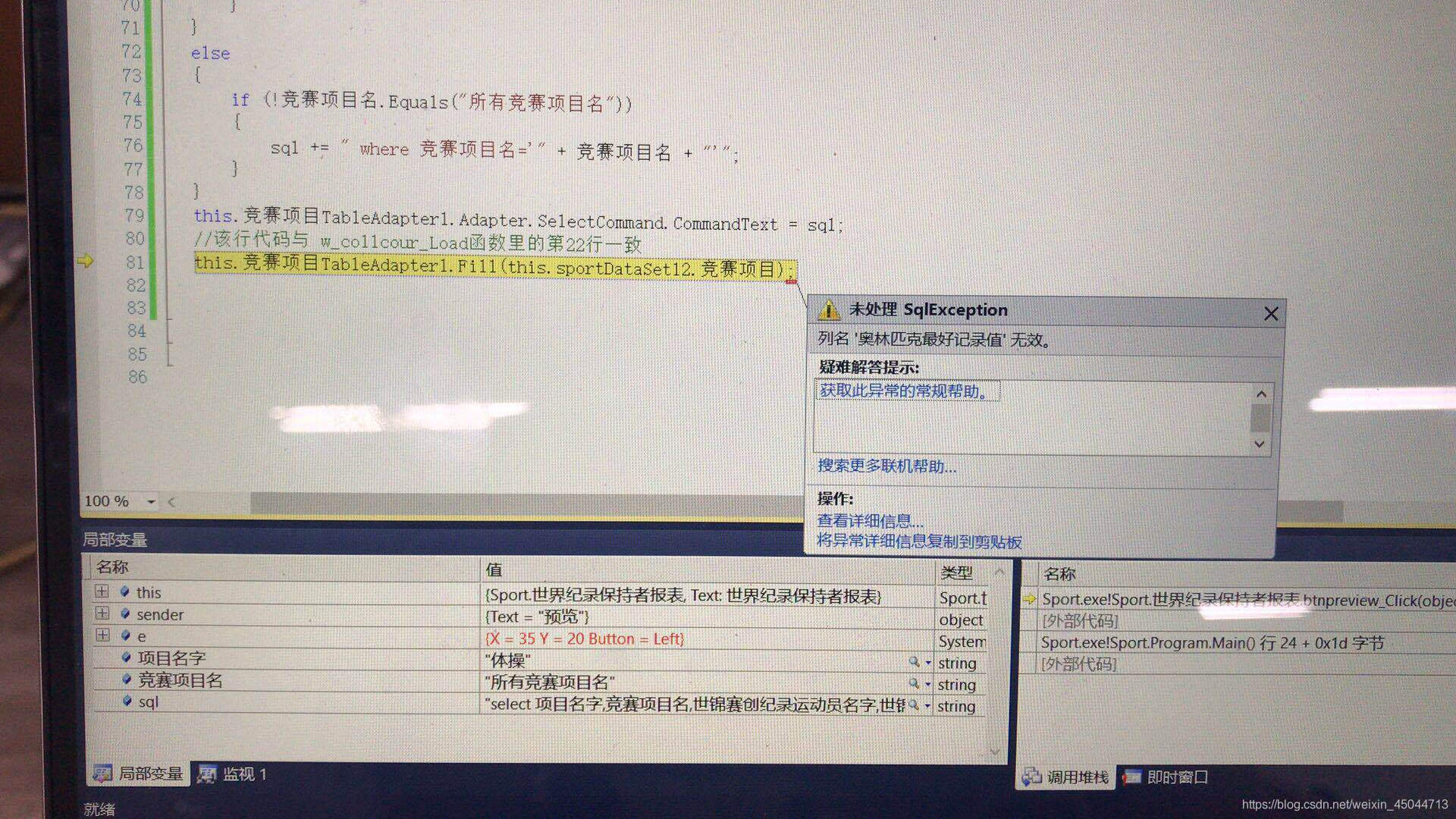 后来从竞赛项目表里面复制了“奥林匹克最好记录值”到sql语句中,替换了自己手打的,再调试就解决了:)