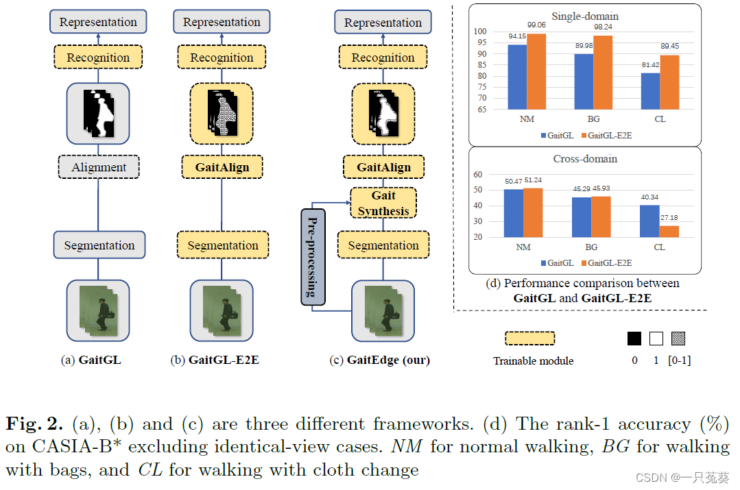 【步态识别】GaitEdge超越普通的端到端识别《GaitEdge: Beyond Plain End-to-end Gait Recognition for Better Practicality》 本文提出了一个新的端到端步态识别框架,称为GaitEdge,可以解决跨域情况下的识别性能下降问题。具体来说,作者设计了一个步态合成模块(Gait Synthesis),用通过形态学算法得到的可调整的边缘掩盖固定的身体。此外,还提出了步态可调整模块(GaitAlign),以解决由上游行人检测任务引起的身体位置抖动问题。作者在CASIA-B和新建立的TTG-200数据集上进行实验,结果表明GaitEdge明显优于以前的方法,可以有效地阻断RGB噪声,是一种更实用的端到端方法。
