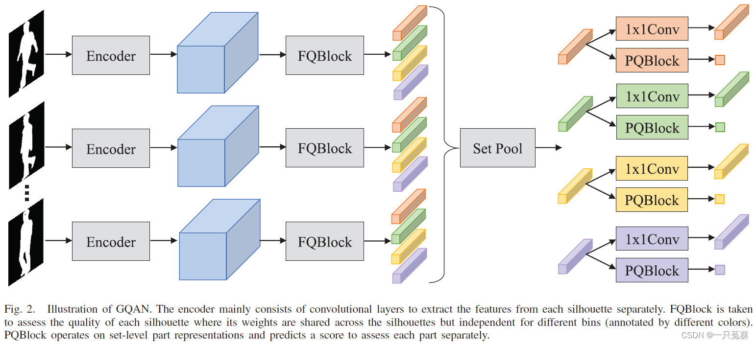 【步态识别】GQAN步态质量感知网络 算法学习《Gait Quality Aware Network: Toward the Interpretability of Silhouette-Based》 本文提出了一个名为GQAN的模型,旨在提高基于剪影的步态识别的可解释性,它试图通过FQBlock和PQBlock两个模块来评估每个剪影和每个部分的识别质量。具体来说,FQBlock以挤压和激发的方式工作,重新校准每个剪影的特征,并将所有通道的分数作为帧质量指标加入。PQBlock为每个部分预测一个分数,以计算probe和gallery之间的加权距离。提出了一个PQLoss使GQAN只使用序列级的身份索引值来进行训练。最终,GQAN在CASIA-B和OU-MVLP的所有行走条件下取得了非常有竞争力的识别性能。