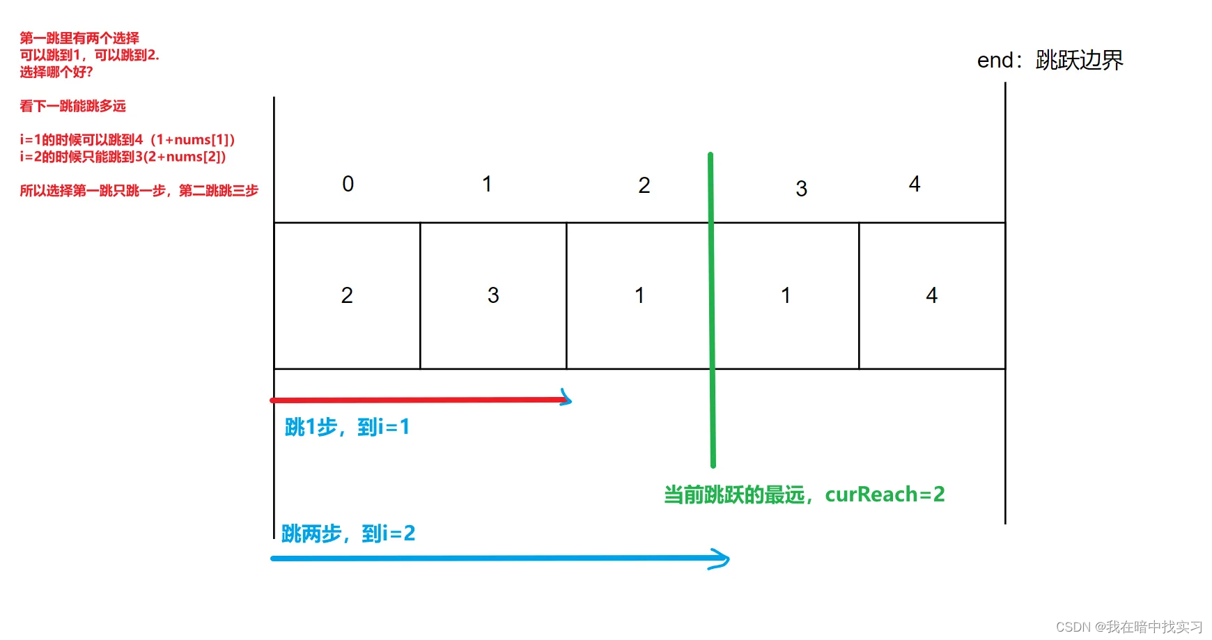 代码随想录刷题训练营|贪心算法|Leetcode45/55跳跃游戏 ● 此时i=2=curReach,说明我们到了第一跳最远的边界,我们需要下一跳,step+1,更新当前的边界为下一跳最远的覆盖,curReach==4,刚好数组的边界就是4,说明我们下一条就可以跳到了,不用再继续了,break。● i=0的时候,是一个前置,下一步可以到的最远是nextReach=0+nums[0]=2,i=curReach,选择跳1次,更新curReach为下一步可以到的最远。● i=2的时候,说明我们选择了跳两步到位置2,位置2起跳的下一次最大覆盖是2+nums[2]=2+1=3<4。