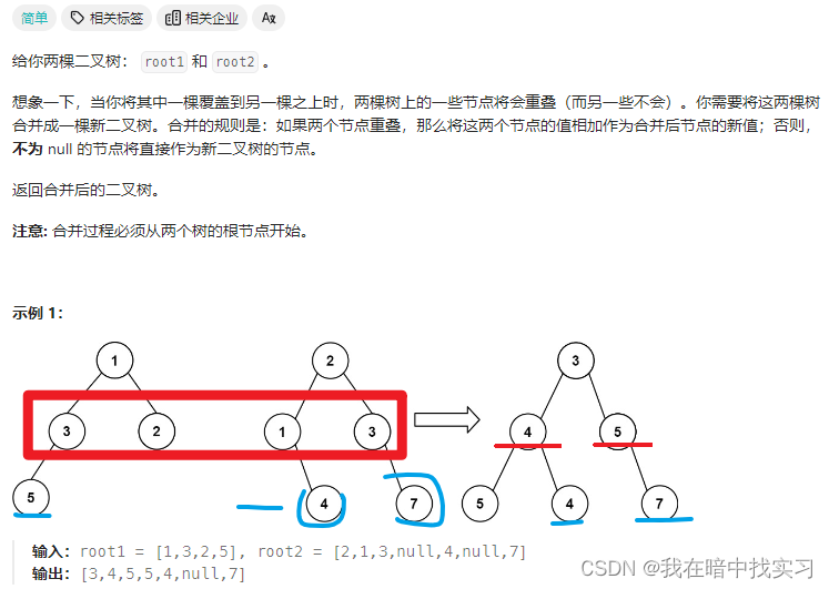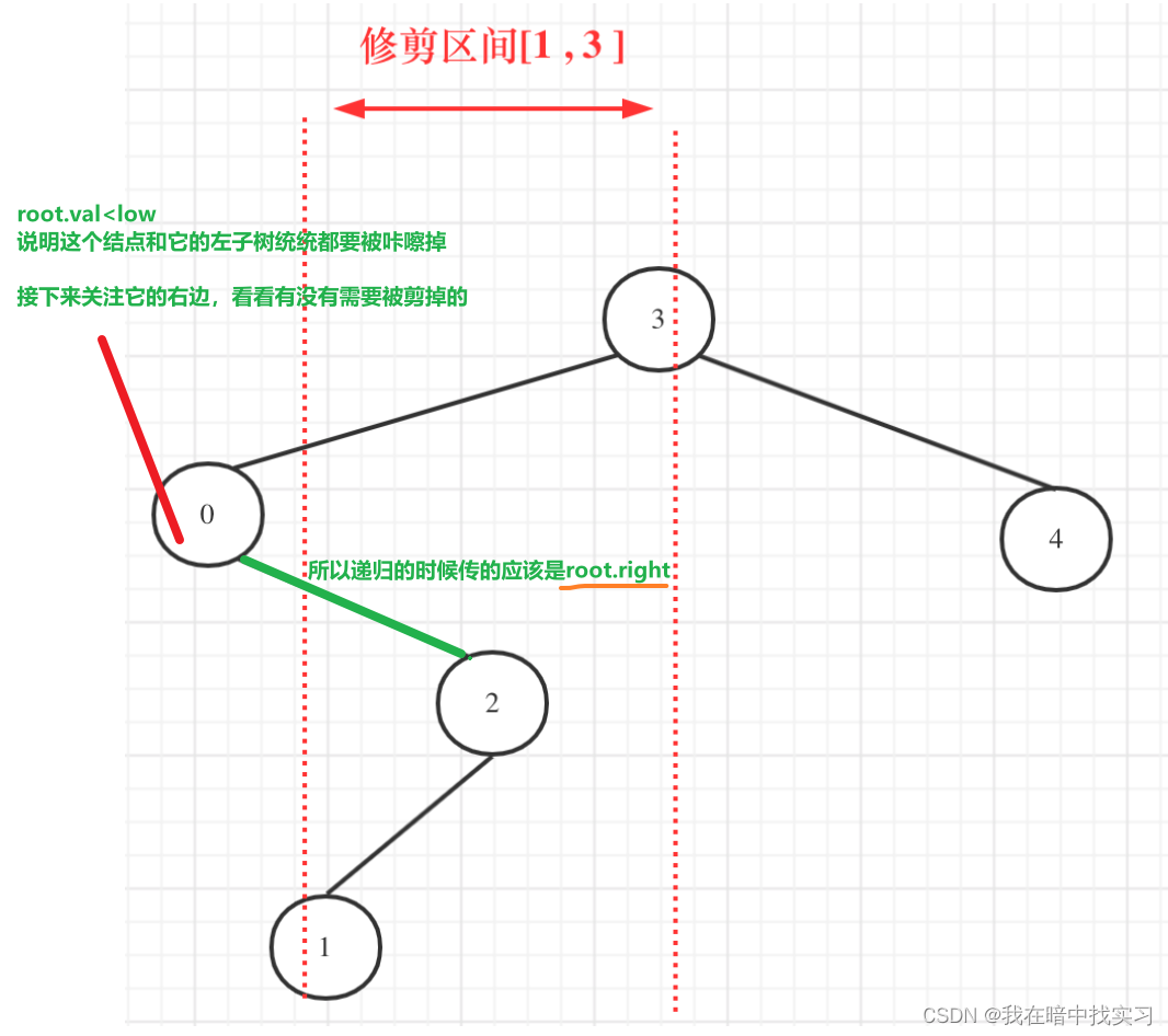 代码随想录刷题训练营DAY22|二叉树part9 这个节点及其子节点都是原树中值在[low, high]范围内的节点,这部分树将被“接上”到更高层的适当位置。在这个特定的场景中,由于原节点的值小于low,newnode实际上是原节点右子树上第一个满足值在[low, high]范围内的节点的根节点。这个递归调用返回的TreeNode newnode代表裁剪后的右子树的根节点。思路:找到中间点,把数组一分为二,分别遍历。,并且作为新的树(或子树)根节点的节点。如果区间是[1,3]的话。2.以中间位置构造结点。
