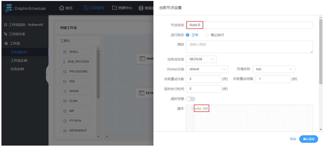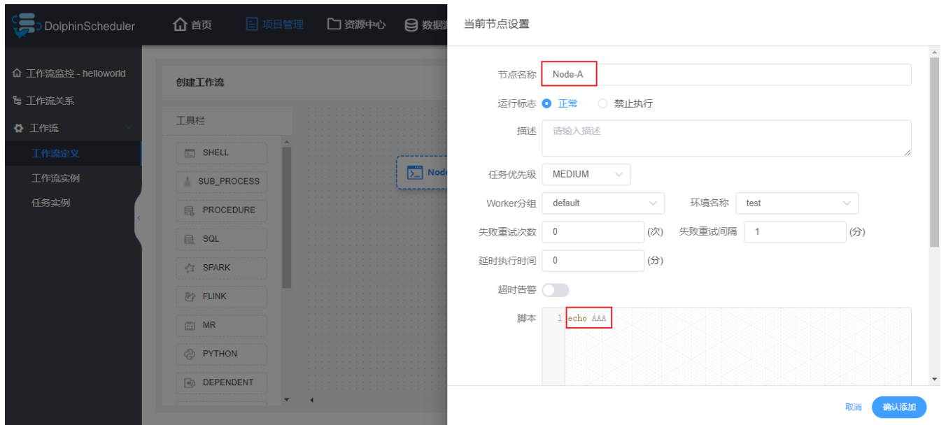 (1)修改 helloworld 工作流 Node-A 节点如下