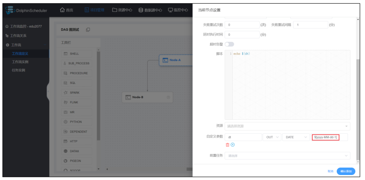 若执行的脚本需要一个格式为 yyyy-MM-dd 的前一天日期的参数,进行如下配置即可。