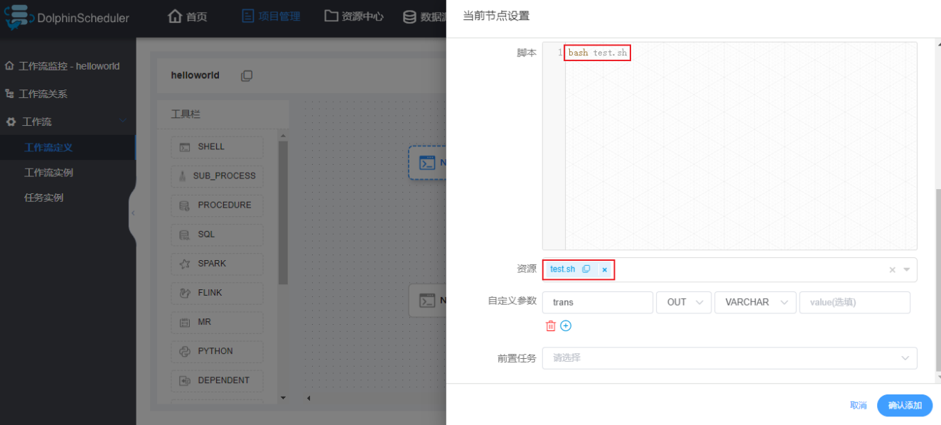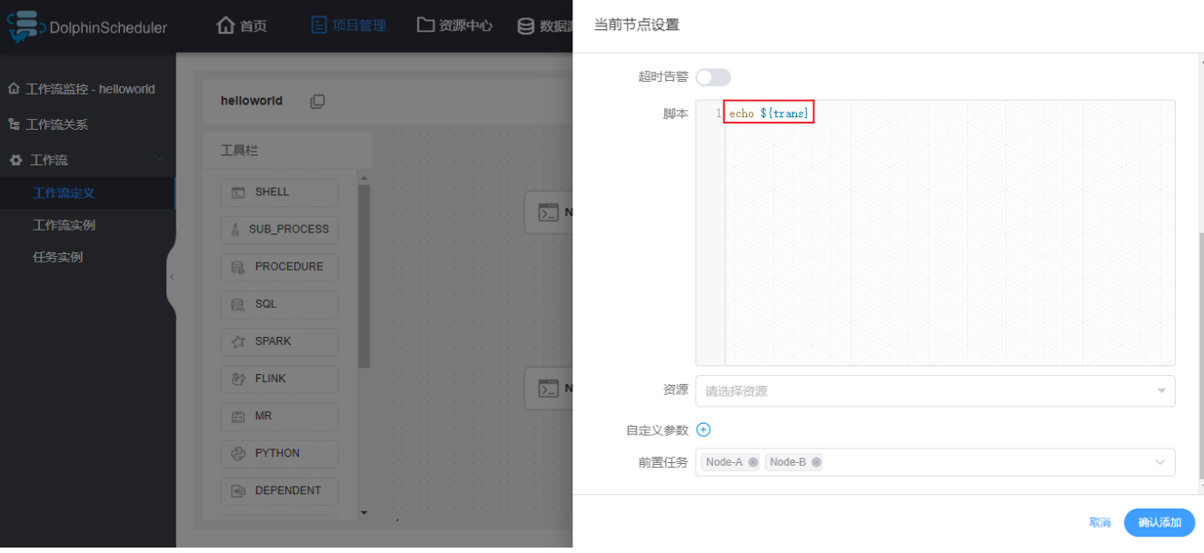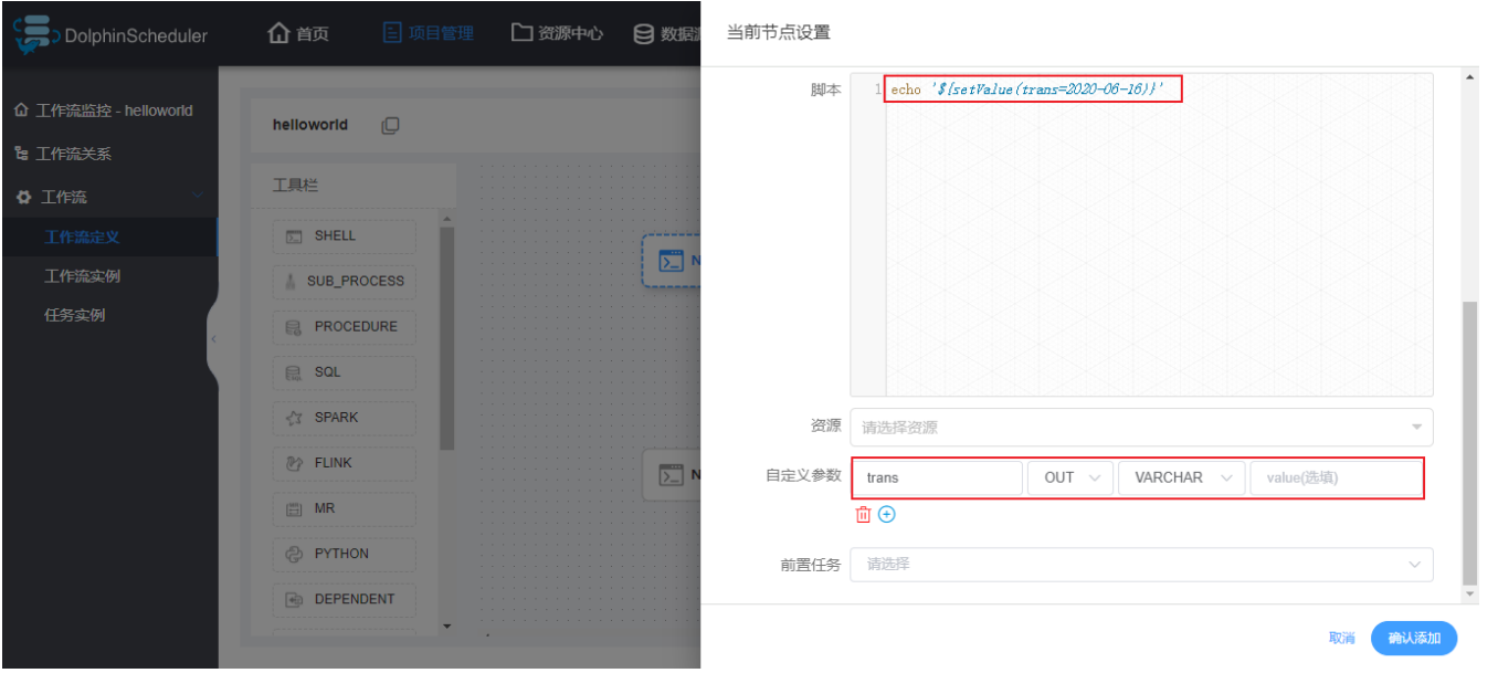 DolphinScheduler 支持上游任务节点向下游任务节点传参。目前支持这个特性的任务类型有:Shell、SQL、Procedure。以下案例使用 Shell 类型的任务节点进行演示。