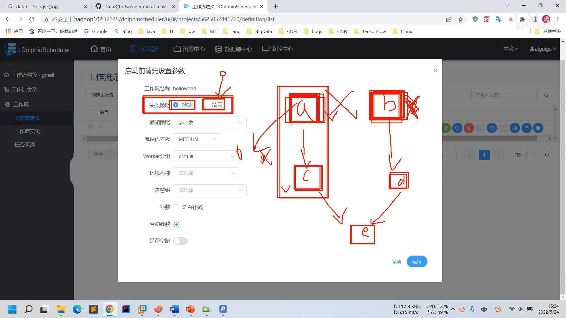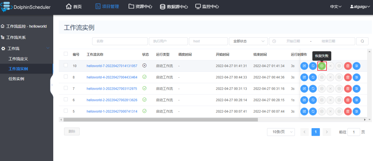 若工作流执行到一半失败了,需要重新启动工作流。重新启动时可选择从起点开始执行,也可选择从断点开始执行。