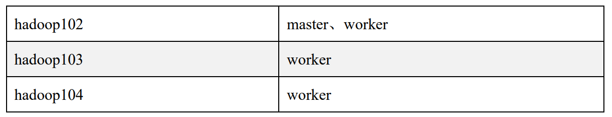 集群模式下,可配置多个 Master 及多个 Worker。通常可配置 2~3 个 Master,若干个Worker。由于集群资源有限,此处配置一个 Master,三个 Worker,集群规划如下。