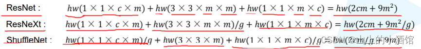 相较于ResNet,ShuffleNet_v1对1*1的卷积进行了分组,并且中间3*3卷积使用DW卷积,组数g=通道数m。