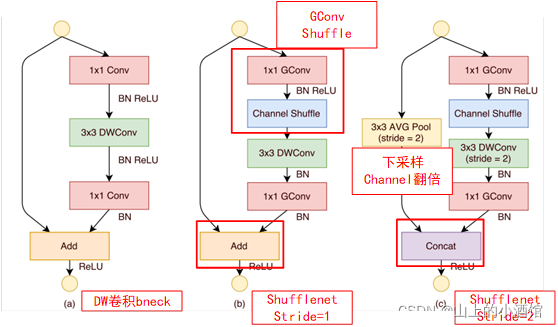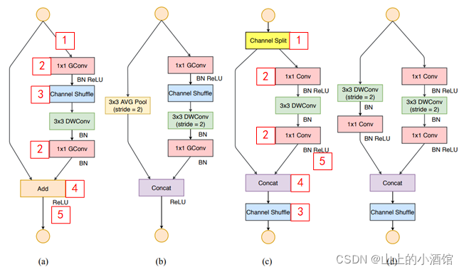 (d)图中下采样操作,通道划分channle_split,输出通道数增加为两倍。