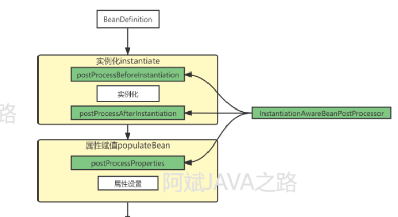 这图里所描述的是,创建Bean时先从BeanDefinition开始,然后实例化Bean,在实例化前后,InstantiationAwareBeanPostProcessor会被调用。