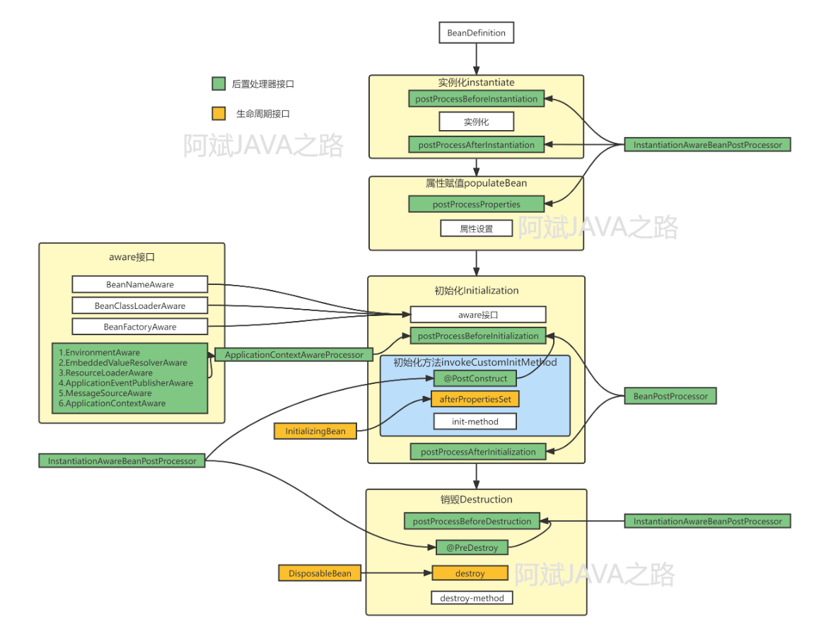 不过这个图应该画错了,它把DestructionAwareBeanPostProcessors写成了InstantiationAwareBeanPostProcessor。