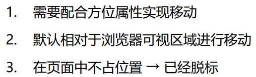 相对于浏览器的可视区域进行定位,作用是让定位的盒子固定在浏览器的某一区域