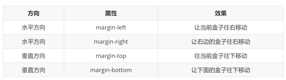 单方向设置:margin-top(盒子自己动) margin-bottom(其他盒子动) margin-left(盒子自己动) margin-right(其他盒子动)