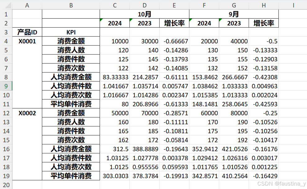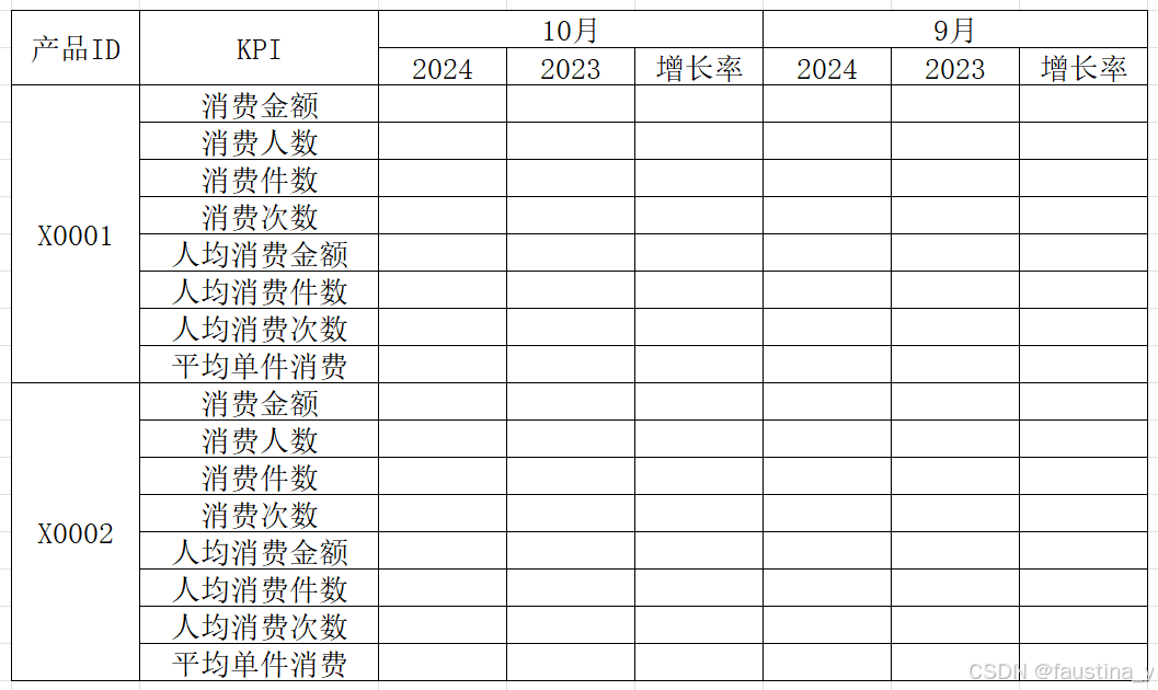 如下为假设的基础数据指标计算/查询结果,接下来用这一数据导入表格: