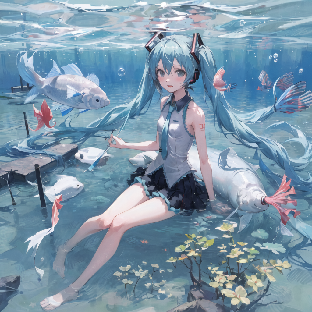 bubble, rating:safe, air_bubble, underwater, 1girl, fish, solo, water, hatsune miku,(Impressionism:1.4),