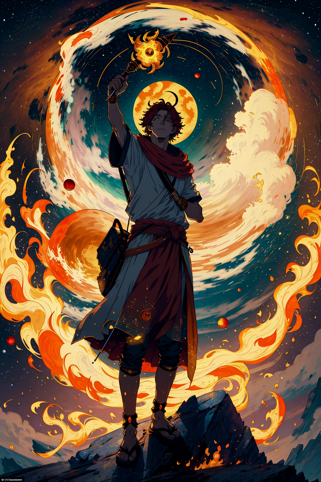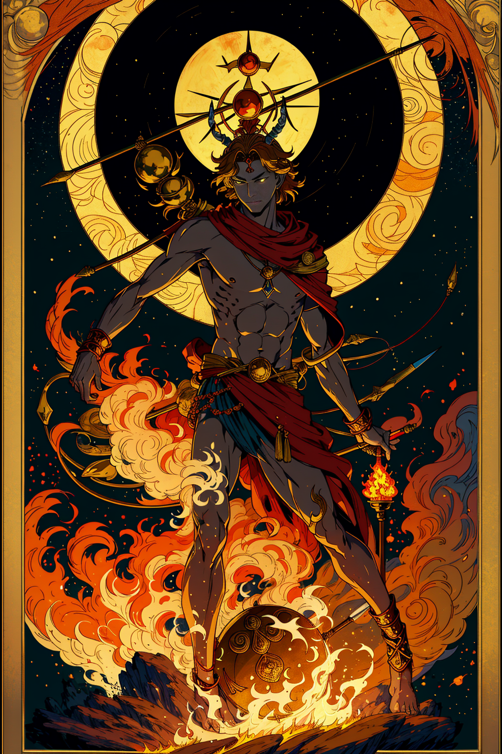 - 描述:将愚者与白羊座的活力、勇气和冒险精神相结合。绘制一个无忧无虑的愚者,手持白羊座的符号,并站在一个充满活力的场景中。