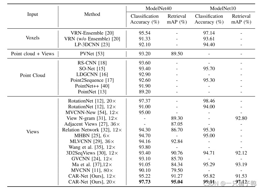 (b)没有利用CAR模块中的视图关系,CAR- net的性能会有一定的下降。这表明多视图方法中的视点关系有助于提高对三维形状的识别。