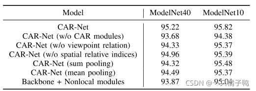 (a)为了显示CAR模块的好处,我们删除了CAR- net中的所有CAR模块,然后使用与之前相同的协议在ModelNet40/10上对生成的模型进行重新培训和测试。