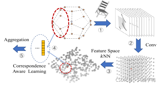 通过kNN搜索在语义空间中显式地发现潜在的视图内对应和视图间对应,然后通过学习变换聚合对应的形状特征。特别是,在学习对应感知特征时,考虑了基于视点位置和视点内位置的对应关系。