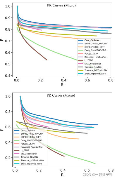 在这个具有挑战性的数据集中,我们的CAR-Net的表现也超过了所有的竞争对手,这再次证明了我们方法的有效性。令人惊讶的是,CAR-Net在2017年的SHREC2017中表现出了明显的优势。与Ma et al.[37]和3D2SeqViews[30]相比,我们的方法总体上也得到了更好的结果。这两种比较方法在不同的指标下显示了不平衡的性能(例如高宏召回和极低的宏精度)。相反,我们的结果在不同的指标上更稳定,实现了相对较高的值。在图7中,我们展示了与可用结果比较的方法的精度-召回(PR)曲线。可以看出,我们的方法在微观和宏观情况下都获得了最佳的PR曲线。