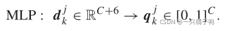 可以看出,这样的描述符包含源语义特征fj,以及fj与其第k个对应关系在视点和视图内位置方面的差异。将每个描述向量传递给共享MLP:![]()